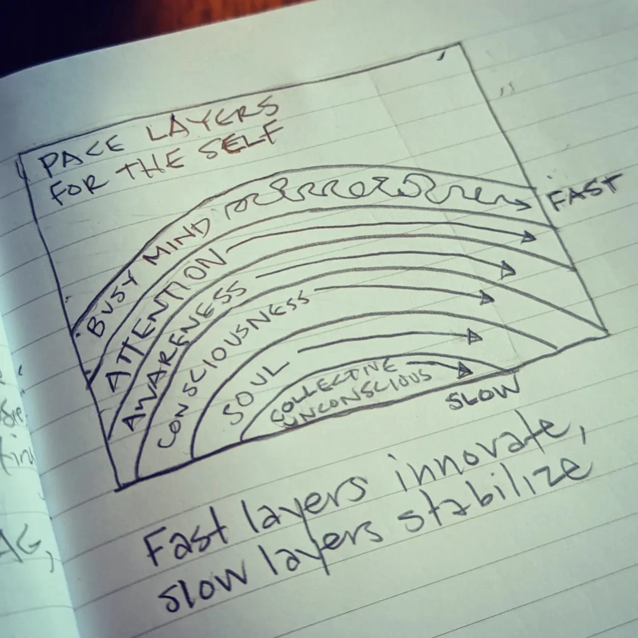 As I spent more and more hours alone in complete absolute darkness, navigating my self and my mind with breath, I started noticing that I could more consciously access different levels of awareness. On the final day, the diagram of pace layers came to me. It was conceived of by Stewart Brand and Brian Eno in 1996 as a way to describe the stability and evolution of complex systems.